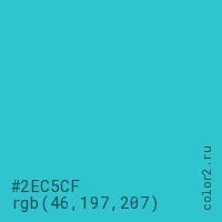 Цвет #2EC5CF в цветовой модели RGB обозначается тремя октетами (46, 197, 207) в десятичном формате и #2EC5CF в шестнадцатиричном (hex) формате, которые являются интенсивностью красного 46 (hex 2E), интенсивность зелёного 197 (hex C5) и интенсивность синего 207 (hex CF).