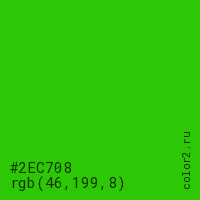 Цвет #2EC708 в цветовой модели RGB обозначается тремя октетами (46, 199, 8) в десятичном формате и #2EC708 в шестнадцатиричном (hex) формате, которые являются интенсивностью красного 46 (hex 2E), интенсивность зелёного 199 (hex C7) и интенсивность синего 8 (hex 08).