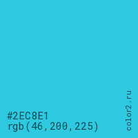 Цвет #2EC8E1 в цветовой модели RGB обозначается тремя октетами (46, 200, 225) в десятичном формате и #2EC8E1 в шестнадцатиричном (hex) формате, которые являются интенсивностью красного 46 (hex 2E), интенсивность зелёного 200 (hex C8) и интенсивность синего 225 (hex E1).