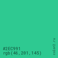 Цвет #2EC991 в цветовой модели RGB обозначается тремя октетами (46, 201, 145) в десятичном формате и #2EC991 в шестнадцатиричном (hex) формате, которые являются интенсивностью красного 46 (hex 2E), интенсивность зелёного 201 (hex C9) и интенсивность синего 145 (hex 91).