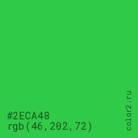 Цвет #2ECA48 в цветовой модели RGB обозначается тремя октетами (46, 202, 72) в десятичном формате и #2ECA48 в шестнадцатиричном (hex) формате, которые являются интенсивностью красного 46 (hex 2E), интенсивность зелёного 202 (hex CA) и интенсивность синего 72 (hex 48).