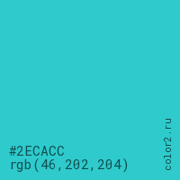 Цвет #2ECACC в цветовой модели RGB обозначается тремя октетами (46, 202, 204) в десятичном формате и #2ECACC в шестнадцатиричном (hex) формате, которые являются интенсивностью красного 46 (hex 2E), интенсивность зелёного 202 (hex CA) и интенсивность синего 204 (hex CC).