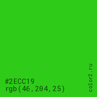 Цвет #2ECC19 в цветовой модели RGB обозначается тремя октетами (46, 204, 25) в десятичном формате и #2ECC19 в шестнадцатиричном (hex) формате, которые являются интенсивностью красного 46 (hex 2E), интенсивность зелёного 204 (hex CC) и интенсивность синего 25 (hex 19).