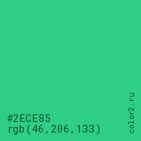 Цвет #2ECE85 в цветовой модели RGB обозначается тремя октетами (46, 206, 133) в десятичном формате и #2ECE85 в шестнадцатиричном (hex) формате, которые являются интенсивностью красного 46 (hex 2E), интенсивность зелёного 206 (hex CE) и интенсивность синего 133 (hex 85).