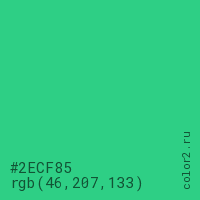 Цвет #2ECF85 в цветовой модели RGB обозначается тремя октетами (46, 207, 133) в десятичном формате и #2ECF85 в шестнадцатиричном (hex) формате, которые являются интенсивностью красного 46 (hex 2E), интенсивность зелёного 207 (hex CF) и интенсивность синего 133 (hex 85).