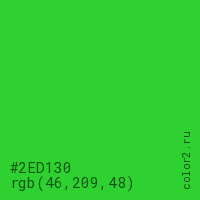 Цвет #2ED130 в цветовой модели RGB обозначается тремя октетами (46, 209, 48) в десятичном формате и #2ED130 в шестнадцатиричном (hex) формате, которые являются интенсивностью красного 46 (hex 2E), интенсивность зелёного 209 (hex D1) и интенсивность синего 48 (hex 30).