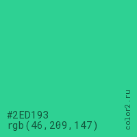 Цвет #2ED193 в цветовой модели RGB обозначается тремя октетами (46, 209, 147) в десятичном формате и #2ED193 в шестнадцатиричном (hex) формате, которые являются интенсивностью красного 46 (hex 2E), интенсивность зелёного 209 (hex D1) и интенсивность синего 147 (hex 93).
