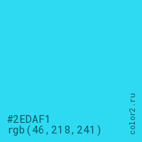 Цвет #2EDAF1 в цветовой модели RGB обозначается тремя октетами (46, 218, 241) в десятичном формате и #2EDAF1 в шестнадцатиричном (hex) формате, которые являются интенсивностью красного 46 (hex 2E), интенсивность зелёного 218 (hex DA) и интенсивность синего 241 (hex F1).