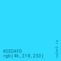 Цвет #2EDAFD в цветовой модели RGB обозначается тремя октетами (46, 218, 253) в десятичном формате и #2EDAFD в шестнадцатиричном (hex) формате, которые являются интенсивностью красного 46 (hex 2E), интенсивность зелёного 218 (hex DA) и интенсивность синего 253 (hex FD).