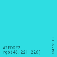 Цвет #2EDDE2 в цветовой модели RGB обозначается тремя октетами (46, 221, 226) в десятичном формате и #2EDDE2 в шестнадцатиричном (hex) формате, которые являются интенсивностью красного 46 (hex 2E), интенсивность зелёного 221 (hex DD) и интенсивность синего 226 (hex E2).