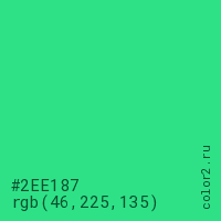 Цвет #2EE187 в цветовой модели RGB обозначается тремя октетами (46, 225, 135) в десятичном формате и #2EE187 в шестнадцатиричном (hex) формате, которые являются интенсивностью красного 46 (hex 2E), интенсивность зелёного 225 (hex E1) и интенсивность синего 135 (hex 87).
