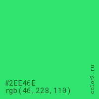 Цвет #2EE46E в цветовой модели RGB обозначается тремя октетами (46, 228, 110) в десятичном формате и #2EE46E в шестнадцатиричном (hex) формате, которые являются интенсивностью красного 46 (hex 2E), интенсивность зелёного 228 (hex E4) и интенсивность синего 110 (hex 6E).