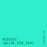 Цвет #2EEECC в цветовой модели RGB обозначается тремя октетами (46, 238, 204) в десятичном формате и #2EEECC в шестнадцатиричном (hex) формате, которые являются интенсивностью красного 46 (hex 2E), интенсивность зелёного 238 (hex EE) и интенсивность синего 204 (hex CC).