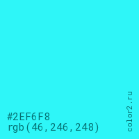Цвет #2EF6F8 в цветовой модели RGB обозначается тремя октетами (46, 246, 248) в десятичном формате и #2EF6F8 в шестнадцатиричном (hex) формате, которые являются интенсивностью красного 46 (hex 2E), интенсивность зелёного 246 (hex F6) и интенсивность синего 248 (hex F8).