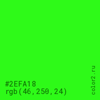 Цвет #2EFA18 в цветовой модели RGB обозначается тремя октетами (46, 250, 24) в десятичном формате и #2EFA18 в шестнадцатиричном (hex) формате, которые являются интенсивностью красного 46 (hex 2E), интенсивность зелёного 250 (hex FA) и интенсивность синего 24 (hex 18).