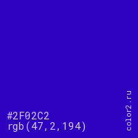 Цвет #2F02C2 в цветовой модели RGB обозначается тремя октетами (47, 2, 194) в десятичном формате и #2F02C2 в шестнадцатиричном (hex) формате, которые являются интенсивностью красного 47 (hex 2F), интенсивность зелёного 2 (hex 02) и интенсивность синего 194 (hex C2).