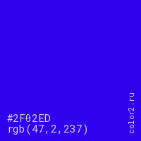 Цвет #2F02ED в цветовой модели RGB обозначается тремя октетами (47, 2, 237) в десятичном формате и #2F02ED в шестнадцатиричном (hex) формате, которые являются интенсивностью красного 47 (hex 2F), интенсивность зелёного 2 (hex 02) и интенсивность синего 237 (hex ED).