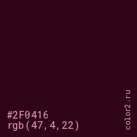 Цвет #2F0416 в цветовой модели RGB обозначается тремя октетами (47, 4, 22) в десятичном формате и #2F0416 в шестнадцатиричном (hex) формате, которые являются интенсивностью красного 47 (hex 2F), интенсивность зелёного 4 (hex 04) и интенсивность синего 22 (hex 16).