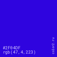 Цвет #2F04DF в цветовой модели RGB обозначается тремя октетами (47, 4, 223) в десятичном формате и #2F04DF в шестнадцатиричном (hex) формате, которые являются интенсивностью красного 47 (hex 2F), интенсивность зелёного 4 (hex 04) и интенсивность синего 223 (hex DF).