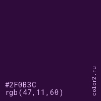 Цвет #2F0B3C в цветовой модели RGB обозначается тремя октетами (47, 11, 60) в десятичном формате и #2F0B3C в шестнадцатиричном (hex) формате, которые являются интенсивностью красного 47 (hex 2F), интенсивность зелёного 11 (hex 0B) и интенсивность синего 60 (hex 3C).