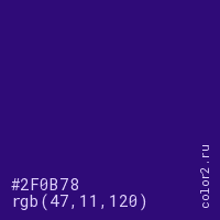 Цвет #2F0B78 в цветовой модели RGB обозначается тремя октетами (47, 11, 120) в десятичном формате и #2F0B78 в шестнадцатиричном (hex) формате, которые являются интенсивностью красного 47 (hex 2F), интенсивность зелёного 11 (hex 0B) и интенсивность синего 120 (hex 78).
