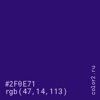 Цвет #2F0E71 в цветовой модели RGB обозначается тремя октетами (47, 14, 113) в десятичном формате и #2F0E71 в шестнадцатиричном (hex) формате, которые являются интенсивностью красного 47 (hex 2F), интенсивность зелёного 14 (hex 0E) и интенсивность синего 113 (hex 71).