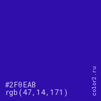 Цвет #2F0EAB в цветовой модели RGB обозначается тремя октетами (47, 14, 171) в десятичном формате и #2F0EAB в шестнадцатиричном (hex) формате, которые являются интенсивностью красного 47 (hex 2F), интенсивность зелёного 14 (hex 0E) и интенсивность синего 171 (hex AB).