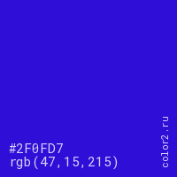 Цвет #2F0FD7 в цветовой модели RGB обозначается тремя октетами (47, 15, 215) в десятичном формате и #2F0FD7 в шестнадцатиричном (hex) формате, которые являются интенсивностью красного 47 (hex 2F), интенсивность зелёного 15 (hex 0F) и интенсивность синего 215 (hex D7).