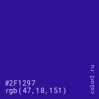 Цвет #2F1297 в цветовой модели RGB обозначается тремя октетами (47, 18, 151) в десятичном формате и #2F1297 в шестнадцатиричном (hex) формате, которые являются интенсивностью красного 47 (hex 2F), интенсивность зелёного 18 (hex 12) и интенсивность синего 151 (hex 97).