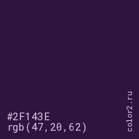 Цвет #2F143E в цветовой модели RGB обозначается тремя октетами (47, 20, 62) в десятичном формате и #2F143E в шестнадцатиричном (hex) формате, которые являются интенсивностью красного 47 (hex 2F), интенсивность зелёного 20 (hex 14) и интенсивность синего 62 (hex 3E).