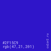 Цвет #2F15C9 в цветовой модели RGB обозначается тремя октетами (47, 21, 201) в десятичном формате и #2F15C9 в шестнадцатиричном (hex) формате, которые являются интенсивностью красного 47 (hex 2F), интенсивность зелёного 21 (hex 15) и интенсивность синего 201 (hex C9).