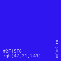 Цвет #2F15F0 в цветовой модели RGB обозначается тремя октетами (47, 21, 240) в десятичном формате и #2F15F0 в шестнадцатиричном (hex) формате, которые являются интенсивностью красного 47 (hex 2F), интенсивность зелёного 21 (hex 15) и интенсивность синего 240 (hex F0).