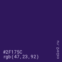 Цвет #2F175C в цветовой модели RGB обозначается тремя октетами (47, 23, 92) в десятичном формате и #2F175C в шестнадцатиричном (hex) формате, которые являются интенсивностью красного 47 (hex 2F), интенсивность зелёного 23 (hex 17) и интенсивность синего 92 (hex 5C).