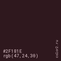 Цвет #2F181E в цветовой модели RGB обозначается тремя октетами (47, 24, 30) в десятичном формате и #2F181E в шестнадцатиричном (hex) формате, которые являются интенсивностью красного 47 (hex 2F), интенсивность зелёного 24 (hex 18) и интенсивность синего 30 (hex 1E).