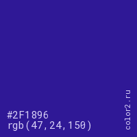 Цвет #2F1896 в цветовой модели RGB обозначается тремя октетами (47, 24, 150) в десятичном формате и #2F1896 в шестнадцатиричном (hex) формате, которые являются интенсивностью красного 47 (hex 2F), интенсивность зелёного 24 (hex 18) и интенсивность синего 150 (hex 96).