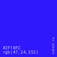 Цвет #2F18FC в цветовой модели RGB обозначается тремя октетами (47, 24, 252) в десятичном формате и #2F18FC в шестнадцатиричном (hex) формате, которые являются интенсивностью красного 47 (hex 2F), интенсивность зелёного 24 (hex 18) и интенсивность синего 252 (hex FC).