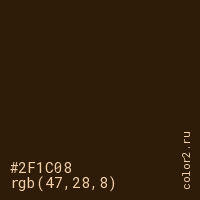 Цвет #2F1C08 в цветовой модели RGB обозначается тремя октетами (47, 28, 8) в десятичном формате и #2F1C08 в шестнадцатиричном (hex) формате, которые являются интенсивностью красного 47 (hex 2F), интенсивность зелёного 28 (hex 1C) и интенсивность синего 8 (hex 08).