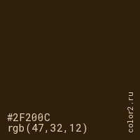 Цвет #2F200C в цветовой модели RGB обозначается тремя октетами (47, 32, 12) в десятичном формате и #2F200C в шестнадцатиричном (hex) формате, которые являются интенсивностью красного 47 (hex 2F), интенсивность зелёного 32 (hex 20) и интенсивность синего 12 (hex 0C).