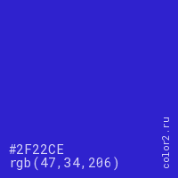 Цвет #2F22CE в цветовой модели RGB обозначается тремя октетами (47, 34, 206) в десятичном формате и #2F22CE в шестнадцатиричном (hex) формате, которые являются интенсивностью красного 47 (hex 2F), интенсивность зелёного 34 (hex 22) и интенсивность синего 206 (hex CE).