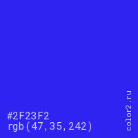 Цвет #2F23F2 в цветовой модели RGB обозначается тремя октетами (47, 35, 242) в десятичном формате и #2F23F2 в шестнадцатиричном (hex) формате, которые являются интенсивностью красного 47 (hex 2F), интенсивность зелёного 35 (hex 23) и интенсивность синего 242 (hex F2).