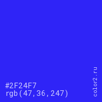 Цвет #2F24F7 в цветовой модели RGB обозначается тремя октетами (47, 36, 247) в десятичном формате и #2F24F7 в шестнадцатиричном (hex) формате, которые являются интенсивностью красного 47 (hex 2F), интенсивность зелёного 36 (hex 24) и интенсивность синего 247 (hex F7).