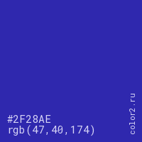 Цвет #2F28AE в цветовой модели RGB обозначается тремя октетами (47, 40, 174) в десятичном формате и #2F28AE в шестнадцатиричном (hex) формате, которые являются интенсивностью красного 47 (hex 2F), интенсивность зелёного 40 (hex 28) и интенсивность синего 174 (hex AE).