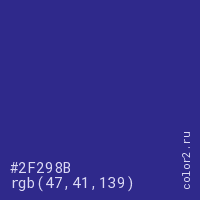 Цвет #2F298B в цветовой модели RGB обозначается тремя октетами (47, 41, 139) в десятичном формате и #2F298B в шестнадцатиричном (hex) формате, которые являются интенсивностью красного 47 (hex 2F), интенсивность зелёного 41 (hex 29) и интенсивность синего 139 (hex 8B).