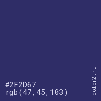 Цвет #2F2D67 в цветовой модели RGB обозначается тремя октетами (47, 45, 103) в десятичном формате и #2F2D67 в шестнадцатиричном (hex) формате, которые являются интенсивностью красного 47 (hex 2F), интенсивность зелёного 45 (hex 2D) и интенсивность синего 103 (hex 67).
