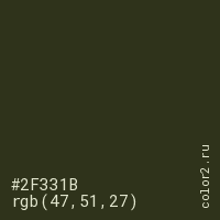 Цвет #2F331B в цветовой модели RGB обозначается тремя октетами (47, 51, 27) в десятичном формате и #2F331B в шестнадцатиричном (hex) формате, которые являются интенсивностью красного 47 (hex 2F), интенсивность зелёного 51 (hex 33) и интенсивность синего 27 (hex 1B).