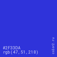 Цвет #2F33DA в цветовой модели RGB обозначается тремя октетами (47, 51, 218) в десятичном формате и #2F33DA в шестнадцатиричном (hex) формате, которые являются интенсивностью красного 47 (hex 2F), интенсивность зелёного 51 (hex 33) и интенсивность синего 218 (hex DA).