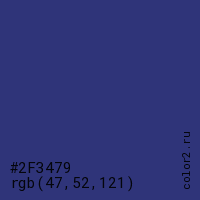Цвет #2F3479 в цветовой модели RGB обозначается тремя октетами (47, 52, 121) в десятичном формате и #2F3479 в шестнадцатиричном (hex) формате, которые являются интенсивностью красного 47 (hex 2F), интенсивность зелёного 52 (hex 34) и интенсивность синего 121 (hex 79).