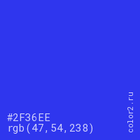 Цвет #2F36EE в цветовой модели RGB обозначается тремя октетами (47, 54, 238) в десятичном формате и #2F36EE в шестнадцатиричном (hex) формате, которые являются интенсивностью красного 47 (hex 2F), интенсивность зелёного 54 (hex 36) и интенсивность синего 238 (hex EE).