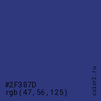 Цвет #2F387D в цветовой модели RGB обозначается тремя октетами (47, 56, 125) в десятичном формате и #2F387D в шестнадцатиричном (hex) формате, которые являются интенсивностью красного 47 (hex 2F), интенсивность зелёного 56 (hex 38) и интенсивность синего 125 (hex 7D).