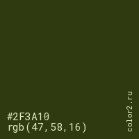 Цвет #2F3A10 в цветовой модели RGB обозначается тремя октетами (47, 58, 16) в десятичном формате и #2F3A10 в шестнадцатиричном (hex) формате, которые являются интенсивностью красного 47 (hex 2F), интенсивность зелёного 58 (hex 3A) и интенсивность синего 16 (hex 10).